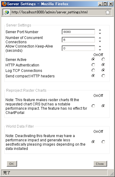 サーバの設定を行うには、Preference から、Server Setting を選びます。 ![]() デフォルトのままで問題は一切発生しませんが、ここで変更する可能性があるのは、以下の項目です。 ・Server Port Number ChartServer V2 を動かす TCP/IP ポート番号を設定します。 ・Number of Concurrent Connections 最大同時接続数ですが、これを増やしてもパフォーマンスが向上する訳ではありません。CPU のコア数+α が妥当な値と考えられます。ちなみに、Windows XP で ChartServer V2 をご利用の場合、この値を 11 以上にすると、Windows XP のライセンス違反となります。 ・Allow Connection Keep-Alive Keep-Alive する秒数を指定します。パフォーマンスが要求される場合以外は、0 で構いません。 ・Send compact HTTP headers これを on にしないと、apache bench が通りません。 会社情報 サイトご利用にあたって |
