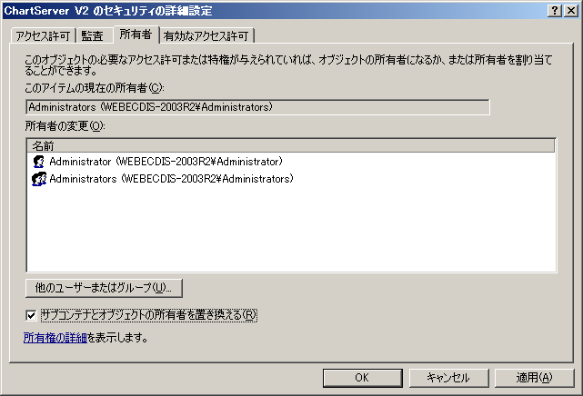 「スタート」ー>「SevenCs」ー>[Uninstall ChartServer V2」 で、ChartServer V2 をアンインストールします。ChartHandler は、「コントロール」パネルの中の「プロラムの追加と削除」の中からアンインストールして下さい。しかし、すでにインストールされた海図は、この方法ではアンインストールできません。また、'C:\SevenCs\ChartServer V2\data' ディレクトリの中をエクスプローラで消そうとすると、 ![]() となり、削除できません。インストールされた海図を削除するには、'C:\SevenCs' 以下のディレクトリの所有者の変更を行います。エクスプローラで 'C:\SevenCs' のフォルダのプロパティーを開き、セキュリティーの詳細設定の中で所有者の変更を行います。 ![]() 「サブコンテナとオブジェクトの所有者も置き換える」をチェックして、'C:\SevenCs' フォルダ以下のすべてのファイルとフォルダの所有者を Administrator にした後、ファイルを削除します。 会社情報 サイトご利用にあたって |