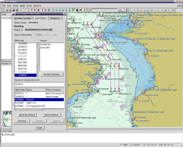 属性は、特定のオブジェクトにを修飾する情報です。S-57 の中には、ちょっと風変わりな属性が2つ定義されています。これらは、SCAMIN(Scale Minumum、表示最小縮尺)と SCAMAX(Scale Maximum、表示最大縮尺)です。 SCAMIN とは、そのオブジェクトが SCAMIN より小縮尺で縮小表示された時、当該オブジェクトを表示させないための属性です。同様に、SCAMAX は、SCAMAX より大縮尺で拡大表示された時、当該オブジェクトを表示させないための属性です。航海用電子海図製品仕様では、SCAMAX は使用が禁止されています。 具体的な例を見てみましょう。以下の例は、SCAMIN 属性が付与されていない場合の表示です。まず、1/100,000 の表示を見てみましょう。 ![]() (画像をクリックすると、1280 x 1024 ピクセルの画像が見れます) 同じセルを 1/200,000 で表示したら、どうなるでしょう。 ![]() (画像をクリックすると、1280 x 1024 ピクセルの画像が見れます) だいぶ、ごちゃごちゃになってきました。かなり見にくいですね。では、同じセルをもっと縮小して 1/400,000 で表示したらどうなるでしょうか。 ![]() (画像をクリックすると、1280 x 1024 ピクセルの画像が見れます) 何が何だかわかりません。これでは、使い物にはなりませんね。 このセルに対して、ENCOptimizer に標準装備されている SCAMIN 設定機能を使って、自動で SCAMIN をつけてみました。縮尺が 1/100,000 の表示は同じですので省略します。 SCAMIN の付いたセルを 1/200,000 で表示してみたのが下の画面です。 ![]() (画像をクリックすると、1280 x 1024 ピクセルの画像が見れます) SCAMIN が付与されていない2つ上の画面と比べて随分すっきりして見やすくなっています。この縮尺ですと、水深が画面に表示されません。主要な特徴だけが表示されています。 下の画面は、さらに縮小して 1/400,000 で表示したものです。 ![]() (画像をクリックすると、1280 x 1024 ピクセルの画像が見れます) これも SCAMIN が付与されていない画面と比べると、雲泥の差です。あるルールで自動的に SCAMIN を付与するだけで、航海目的の違うセルに切り替えなくても、見やすい航海用電子海図になります。 ECDIS では、同じ場所に 1/400,000 より大縮尺で、かつこのセルより小縮尺のセルが通常はあるので、この画面を見る事はないと思います。 具体的な SCAMIN の値を見てみましょう。SOUNDG(Sounding Depth、水深)の SCAMIN の値は 120000 になっています。実際に 1/120,000 で表示したのが下の画面です。 ![]() (画像をクリックすると、1280 x 1024 ピクセルの画像が見れます) 縮尺を 1/120,001 にして表示すると、水深が全部消えて、下の画面になります。 ![]() (画像をクリックすると、1280 x 1024 ピクセルの画像が見れます) この例では全ての水深が同じ値の SCAMIN 属性を持つため、ある縮尺より小さく表示すると全ての水深が画面から消えてしまいます。 本来は、水深を縮小表示した時は、地形の特徴を表すような重要な水深については、より大きな SCAMIN 値を与えます。つまり、重要な水深は、縮小表示しても画面に残るように電子海図を編集します。 会社情報 サイトご利用にあたって |
